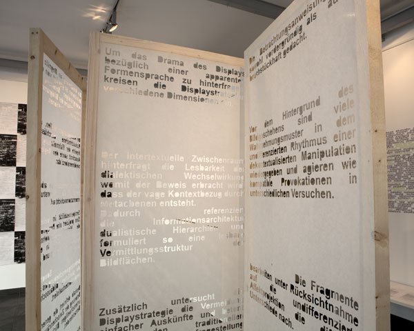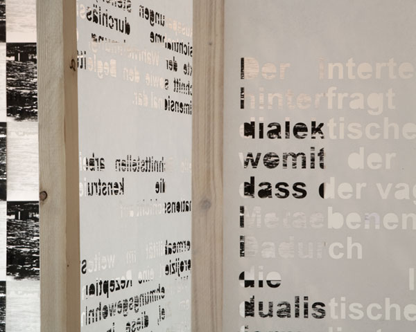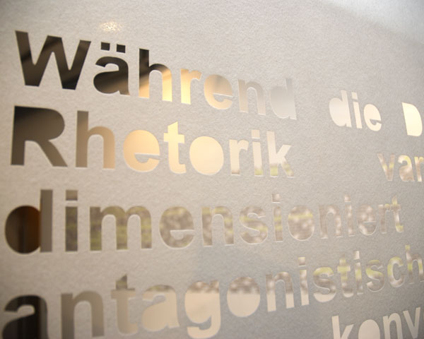 Random texts are generated with the text generator www.worte.at using selected terms. The resulting sentences are cut out of white glass fibre foil, which is then mounted on a wooden frame.