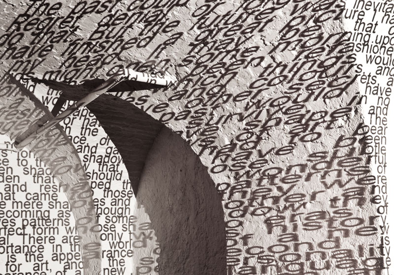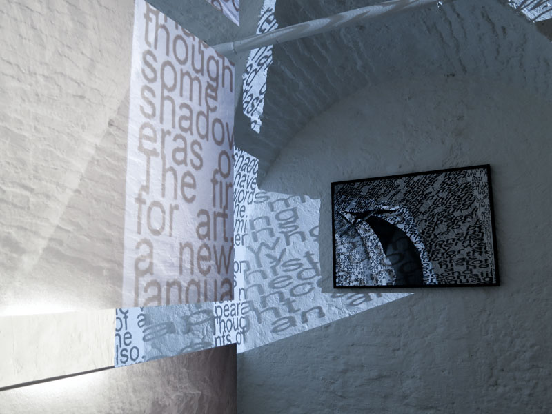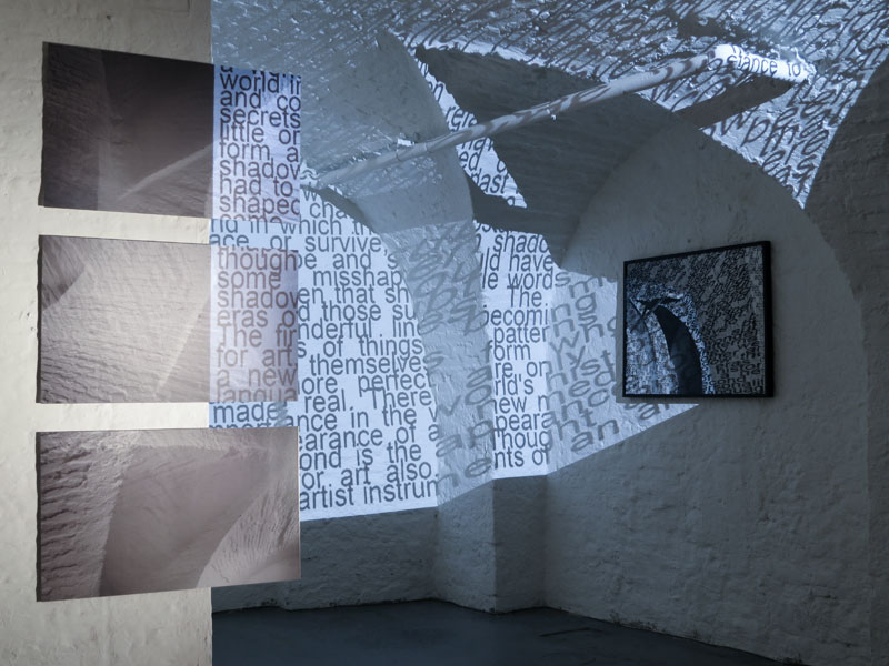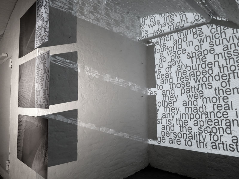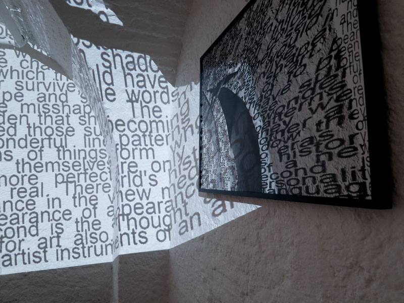 The interaction between the found architectural features and the projected text suspends the distinction between the work and the space around it.By using different forms of citation text and installation form a Möbius strip of self-reflection.