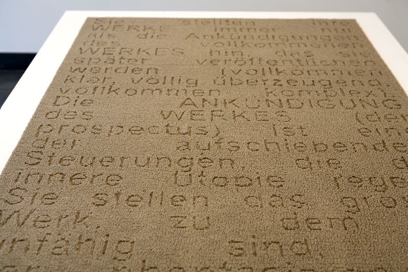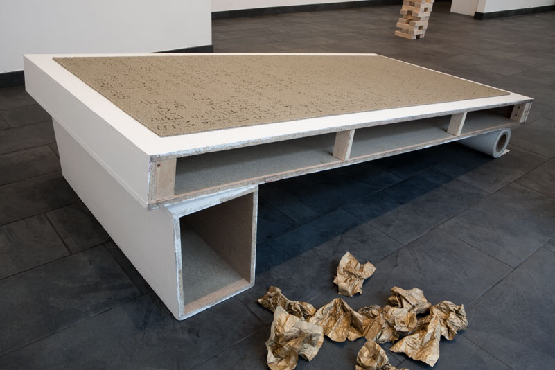 The carpet on top has a revised text excerpt of Roland Barthes self biography about the intention to create the perfect work. sculpture: pedestals, paper roll, carpet, text, handkerchiefs, gold spray, 2m x 1m x 45cm