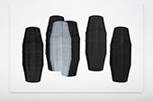 Einen weiteren solchen Objekttransfer vollzieht Laussegger in einer zweiten Werkgruppe. The passion of structure (2023) dreht sich um das Motiv der Drahtspule – Fundstücke derselben Athenreise, die bereits zu einer Skulpturengruppe mit Keramikrepliken wurden (The Passion of CMYK, 2022) und in der Arbeit The passion of structure nun sowohl skulptural als auch motivisch im Siebdruck in Erscheinung treten. In der Auseinandersetzung mit dem industriellen Objekt adressiert Laussegger dabei das Verhältnis von Handarbeit und maschineller Fertigung als Thema, wie es auch Siebdruck als Medium der Massenreproduktion impliziert.
