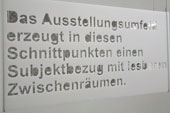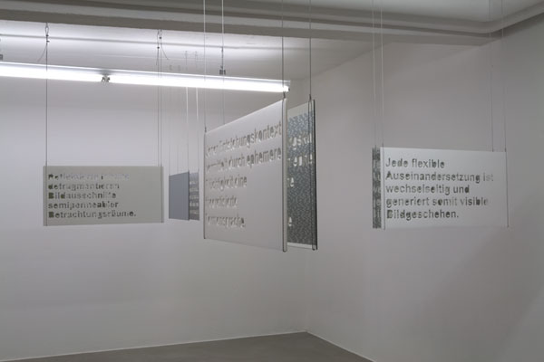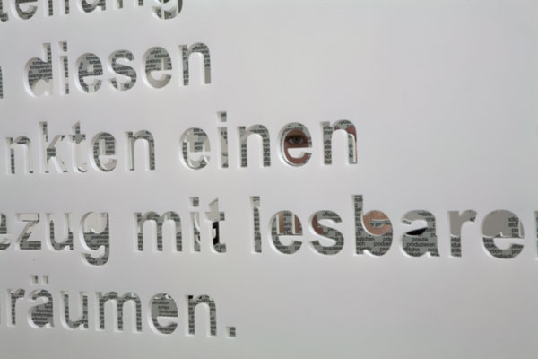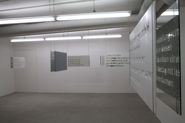 This installation consists of six pieces. Each piece shows an auto-generated text phrase. The texts are cut out of acrylic sheets, which reveals the view on the second layer of the installation: The second layer consists of mirrors, which reflect the complete word collection that is mounted on the back side of the sheets as well as the exhibition room and the viewer.